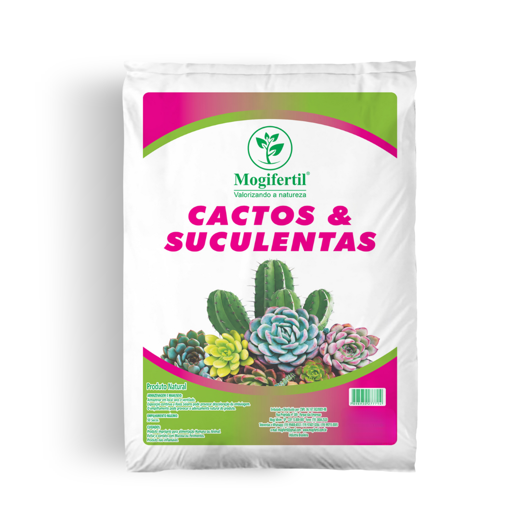 Produto Cactos e Suculentas da Mogifertil é um substrato orgânico preparado a base de matérias primas enriquecidas com microrganismos benéficos ao solo. 100% natural, isentos de agrotóxicos e pragas. Produto leve e bem aerado, proporciona o melhor equilíbrio entre drenagem e retenção de água.